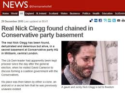 When your own party can't stand the sight of your face, it may be time to think again. Thinking again is precisely what a high profile Lib Dem councillor is calling on Clegg to do. Warren Bradley, Leader of the Lib Dems on Liverpool City Council, has called on Clegg to pull the plug on the coalition - to save the party from annihilation. I doubt he will change course now - he's too far down the road to becoming a true-blue Tory. It would be great if he did - to grow a conscience and 'screw his courage to the sticking place'. However, I intend to stick to my earlier prediction. At the time of the next General Election, Clegg will have resigned as Lib Dem leader and will be standing as a Conservative. Heaven knows - he practically is one now.